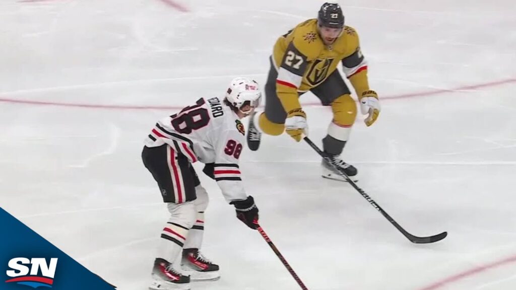 Watch was Chicago Blackhawks forward Connor Bedard collects speed in the neutral zone before showing off his super quick release to go bar down vs. the Vegas Golden Knights in the third period.