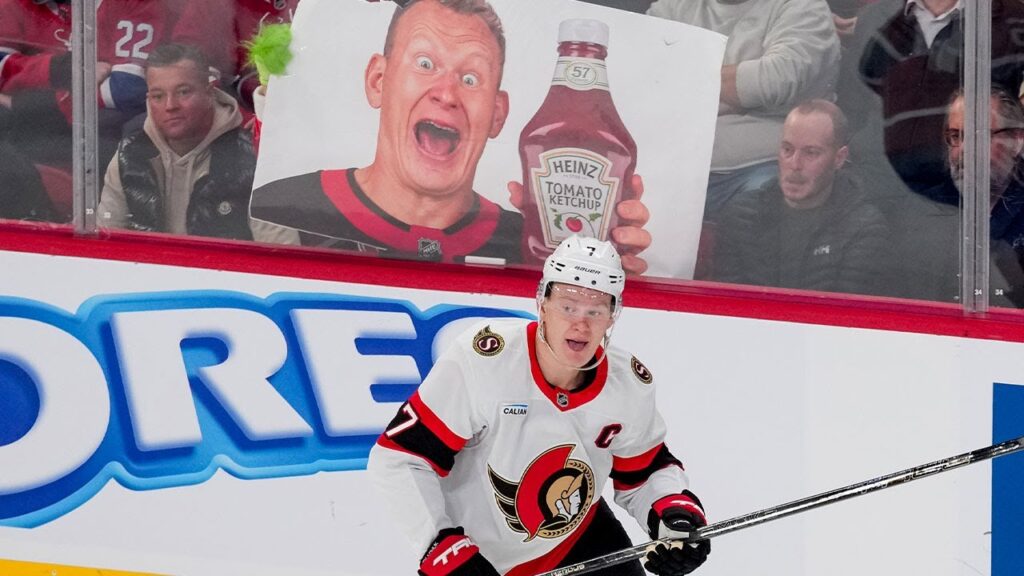 Senators Captain Brady Tkachuk has his first goal in 3 games since returning from injury, extending Ottawa’s lead to 5-2 over the Canadiens