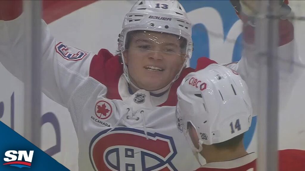 Watch as Montreal Canadiens forward Cole Caufield finds a way to score on Pittsburgh Penguins goalie Tristan Jarry from below the goal line on the power play.