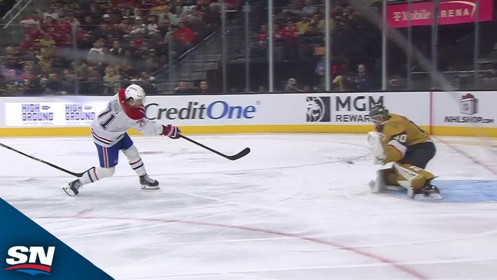 Watch as Las Vegas Golden Knights forward Mitch Marner loses the puck, allowing the Montreal Canadiens to break the other way with forward Jake Evans finishing on the breakaway in this Black Firday matchup.