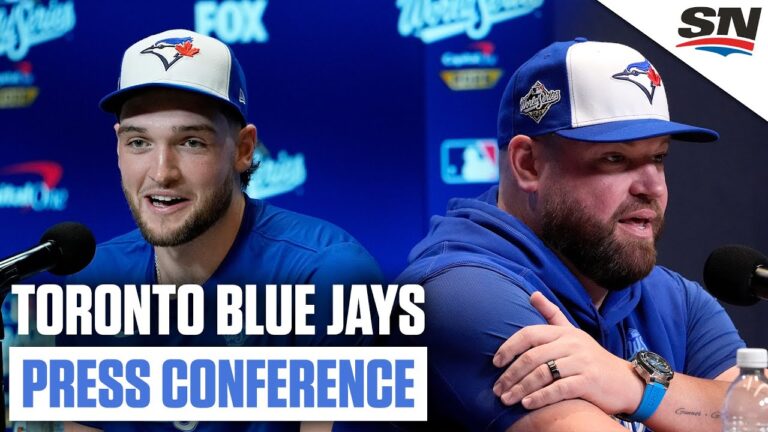 Toronto Blue Jays manager John Schneider and game 1 starter Trey Yesavage field questions from the media ahead of the...