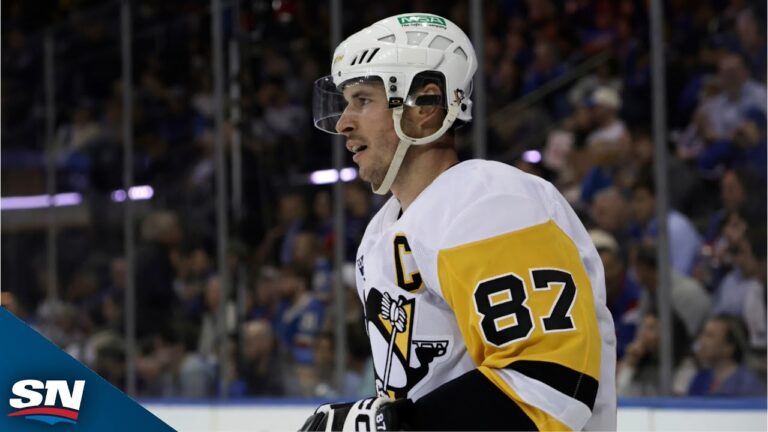 Pittsburgh Penguins captain Sidney Crosby buries a rebound off the pad of goaltender Dan Vladar for his 58th career goal...
