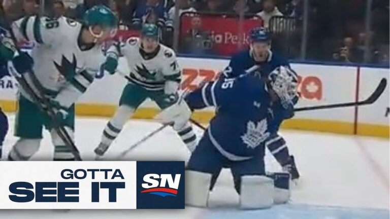 Watch as Toronto Maple Leafs' Dennis Hildeby saves a point shot from San Jose Sharks' Timothy Liljegren and then makes...