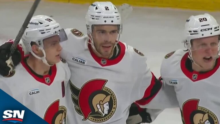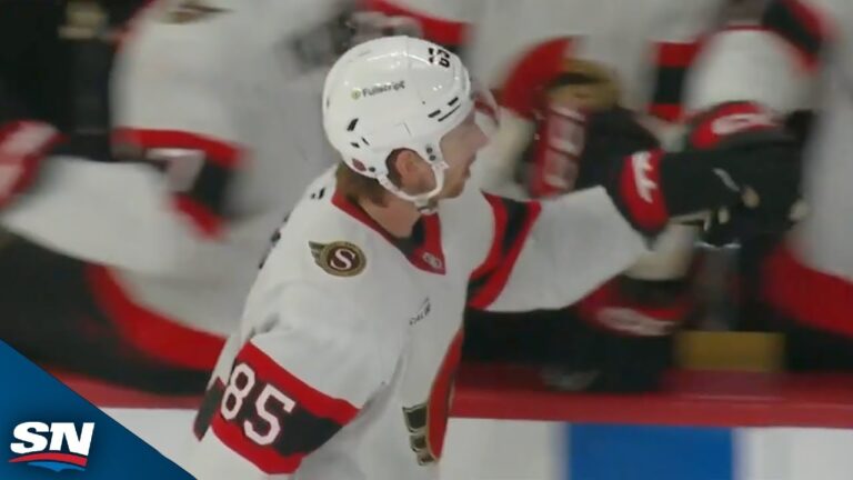 Watch as Ottawa Senators' Jake Sanderson muscles his way past Noah Dobson before switching over to his backhand to tuck...