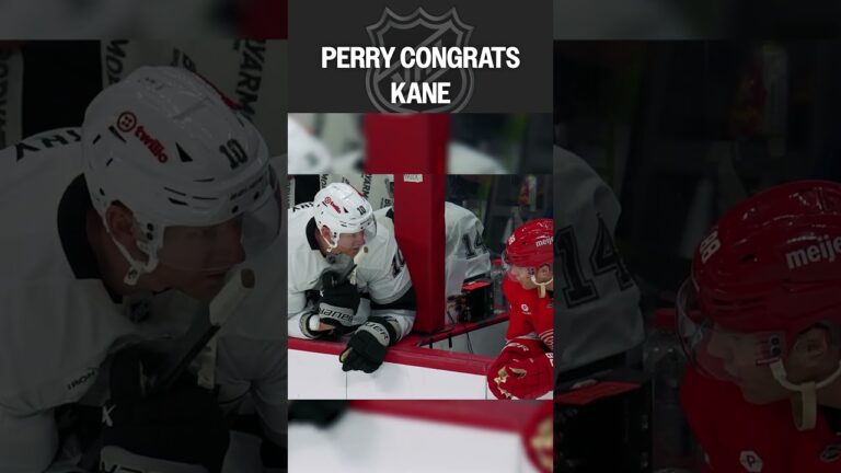Kings forward Corey Perry gives congrats to Patrick Kane, who with a secondary assist on the Red Wings' only goal...