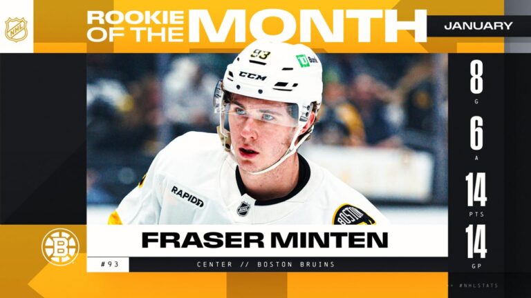 NEW YORK -- Boston Bruins center Fraser Minten, who topped all rookies with 8-6—14 and a +12 rating in 14...