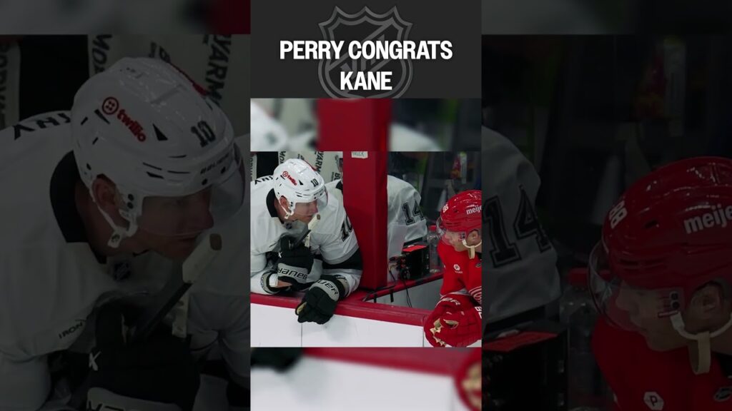Kings forward Corey Perry gives congrats to Patrick Kane, who with a secondary assist on the Red Wings’ only goal of the game, reached 1374 career points and drew even with Mike Modano for the most points by a U.S born player in NHL history.