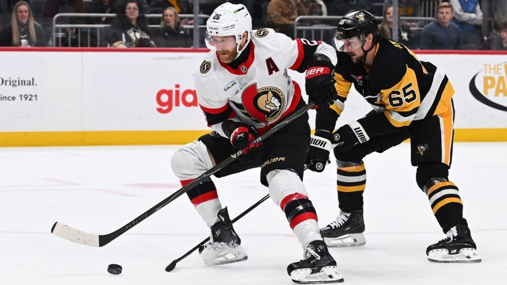 NOTES: Giroux has 41 points (13 goals, 28 assists) in 33 games at PPG Paints Arena. He has the most points and assists among all visiting players, and his 13 goals are the third-most behind Alex Ovechkin (16) and Jakub Voracek (14). … Senators defenseman Thomas Chabot had two shots on goal in 20:41 of ice time after being a game-time decision. He was pulled from a 4-1 win against the New Jersey Devils in the third period on Saturday for precautionary reasons. … Malkin, with his assist on Chinakhov’s goal, extended his home point streak to eight games (nine points; two goals, seven assists). He is the second player age 39 or older in the past 10 years with a streak that long, joining Washington Capitals forward Alex Ovechkin (eight games in 2024-25).