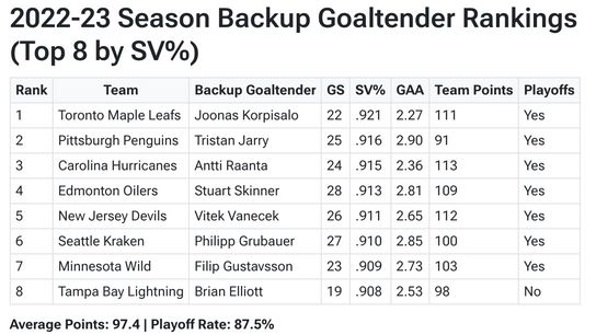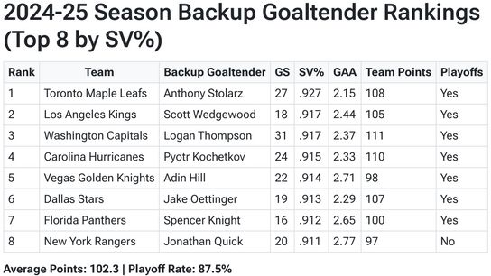 The 2024-25 season demonstrated that teams investing in quality backup goaltending were rewarded with both regular season success and playoff berths at more than double the rate of their competitors.