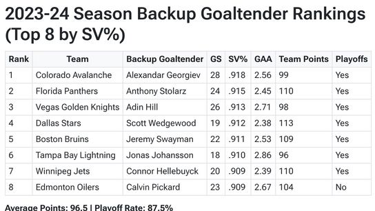- Top 8 Teams (by Backup SV%): Averaged 96.5 points