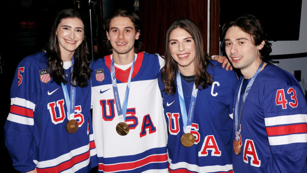 The brothers — wearing Team USA jerseys and their newly minted Olympic gold medals — joined host Connor Storrie on stage during his monologue, along with two members of the gold-medal winning women’s team, Hilary Knight and Megan Keller, also rocking their new bling.