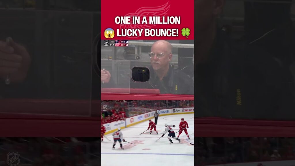 Detroit Red Wings forward Alex Debrincat dumps the puck in and gets lucky bounce off the camera hole on the glass and into the back of the net for the equalizer!