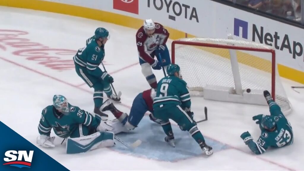 Colorado Avalanche star Nathan MacKinnon is awarded a goal after San Jose Sharks forward Jeff Skinner crashes into the net and dislodges it before the puck crosses the line.