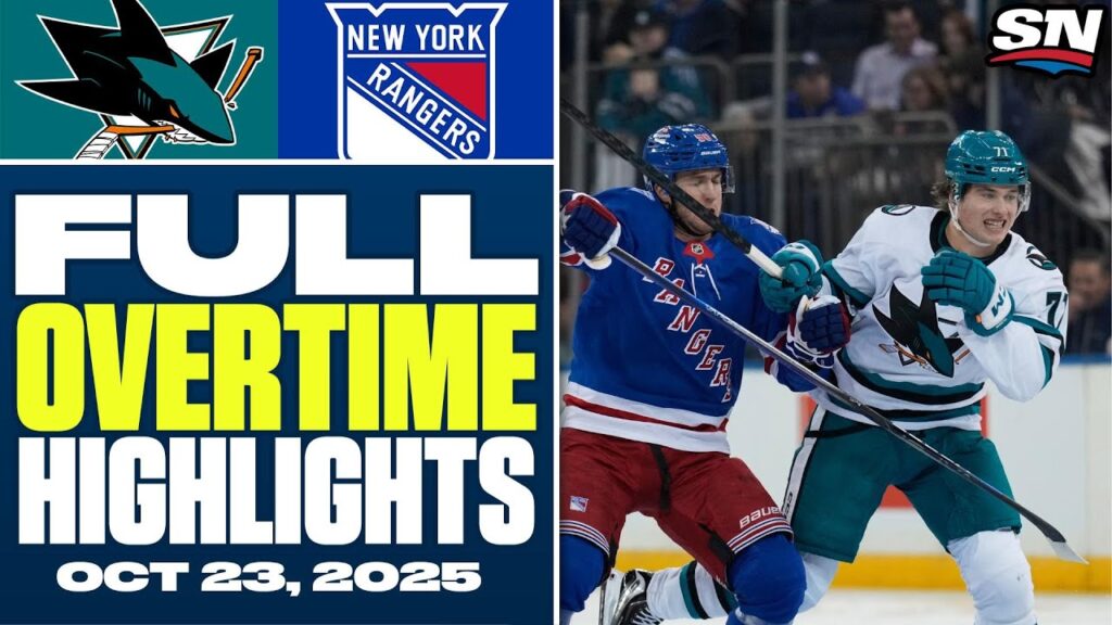 Watch the full overtime highlights between the San Jose Sharks and the New York Rangers from October 23, 2025.