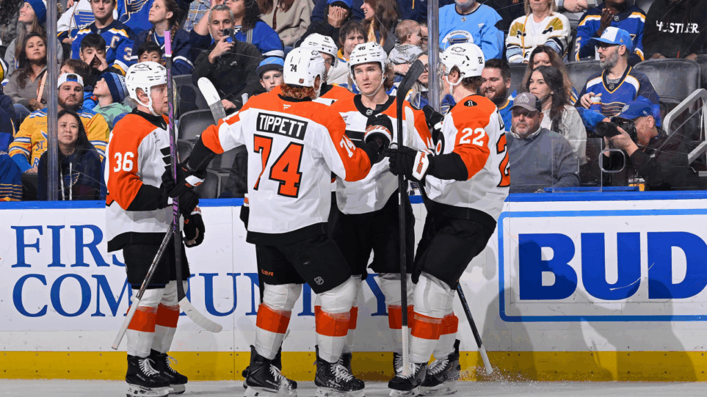“A lot of game left, stick with it,” Philadelphia coach Rick Tocchet said of rallying twice in the third period. “That’s really all you can do. Yeah, we’re fighting it and struggling early and then, obviously, the ‘Devo’ line (Tippett-Dvorak-Zregras) was terrific tonight, and they got us back in the game.”
